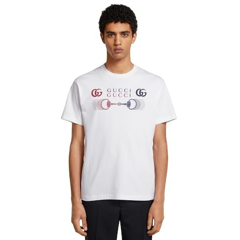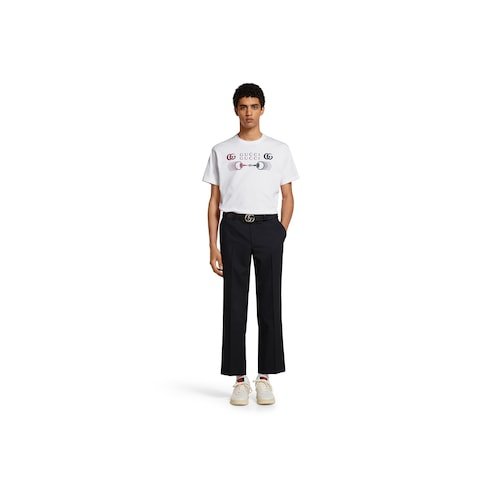 Alcuni dettagli storici della Maison impreziosiscono una selezione di capi ready-to-wear. Questa T-shirt dalla vestibilità regolare, realizzata in jersey di cotone bianco, è definita da una stampa Doppia G e Morsetto abbinata a un discreto logo ricamato a completare il look.