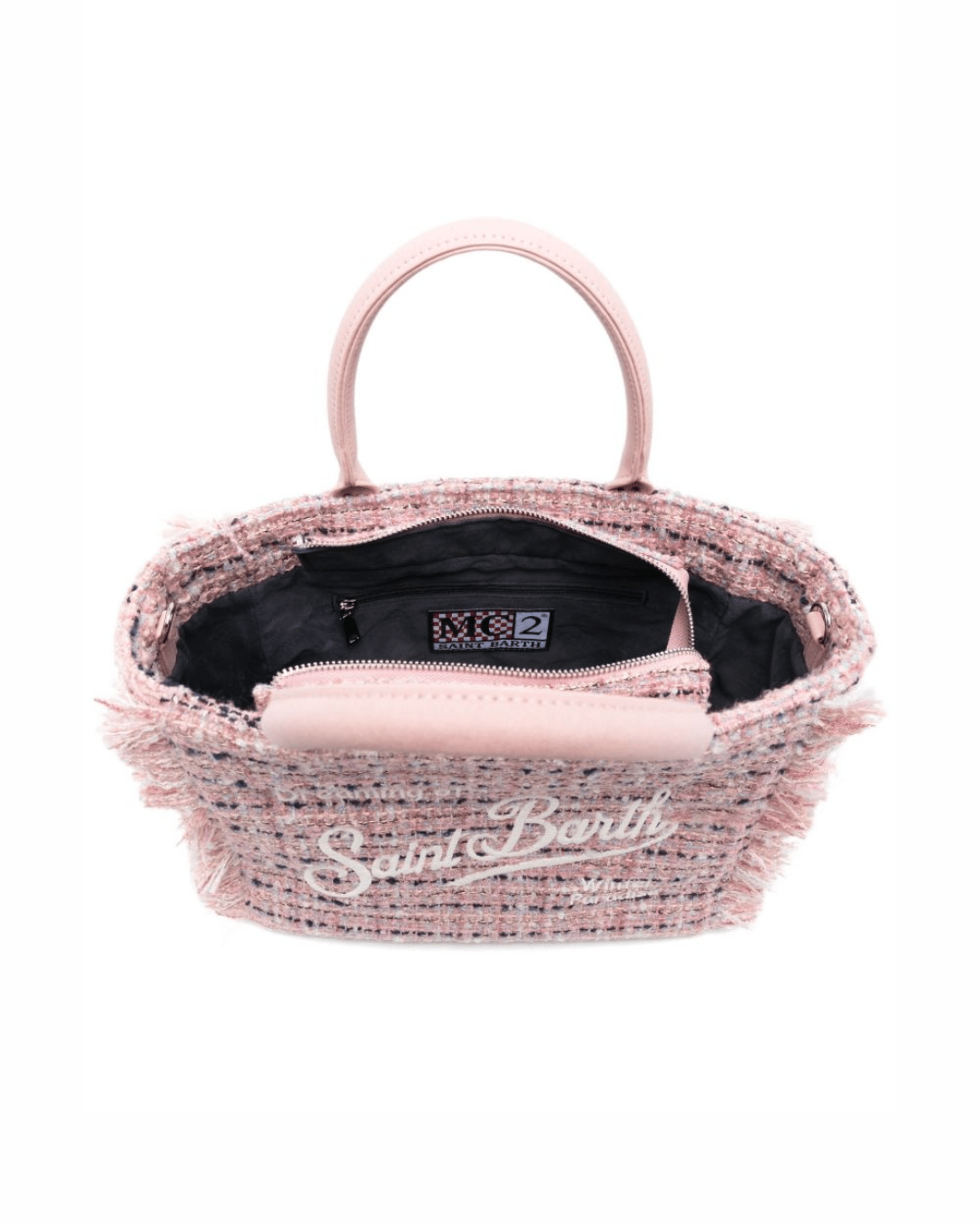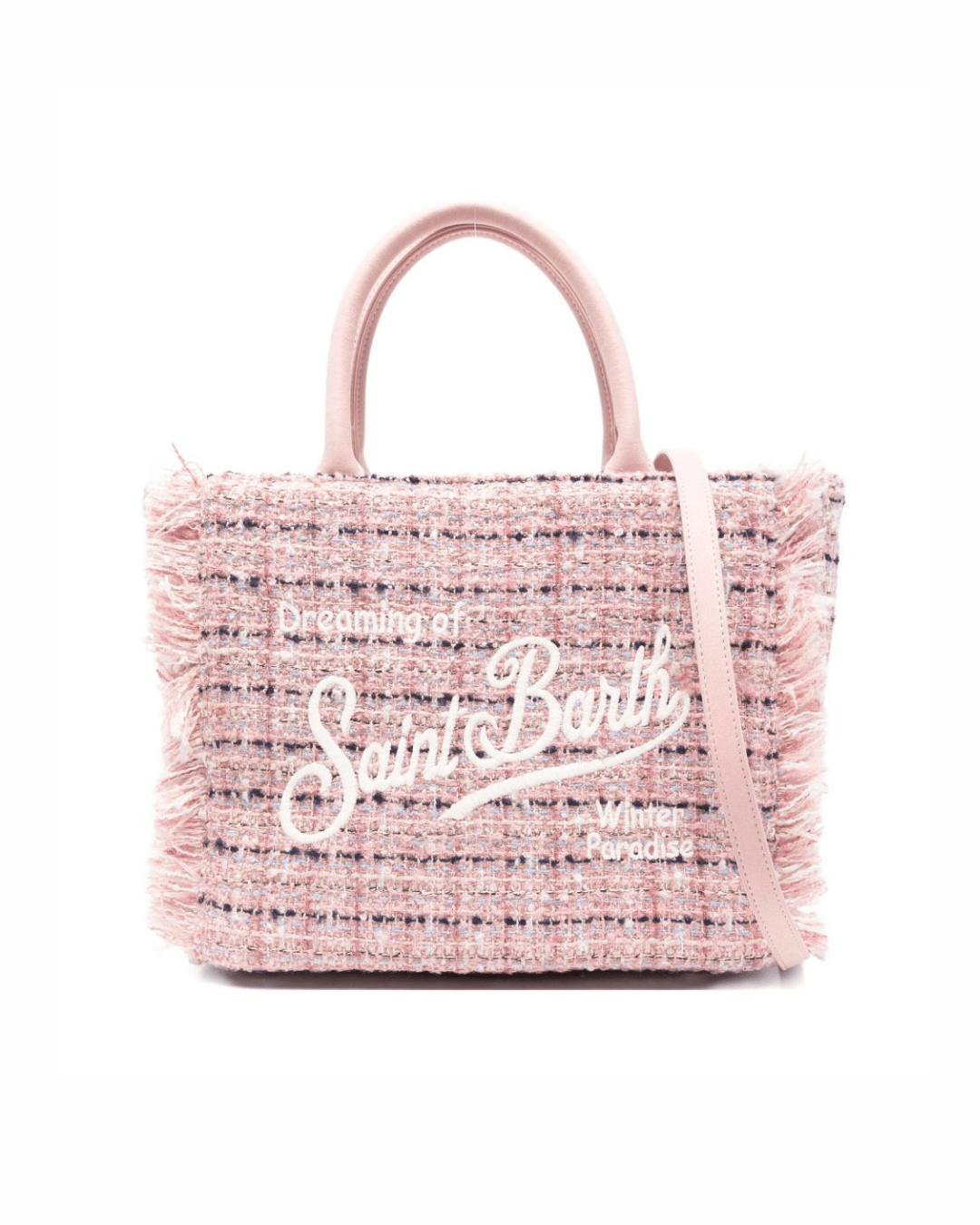 realizzata in misto lana bianca, logo ricamato, tessuto tweed, tracolla regolabile e removibile, chiusura superiore con zip, tasca interna, larghezza 25 cm, lunghezza 27 cm, profondità 14 cm, 70% poliestere, 30% lana