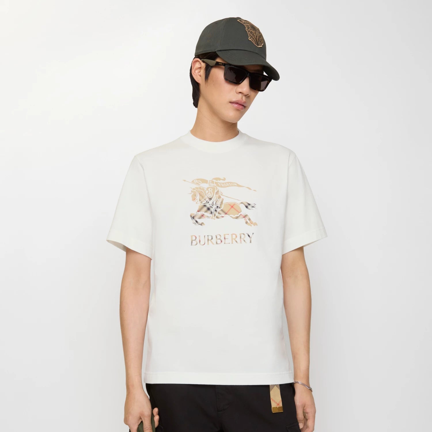 T-shirt realizzata in jersey di cotone leggero con vestibilità slim. Il modello girocollo è decorato da una stampa con logo ed Equestrian Knight Design con il motivo Burberry Check in versione sfumata.